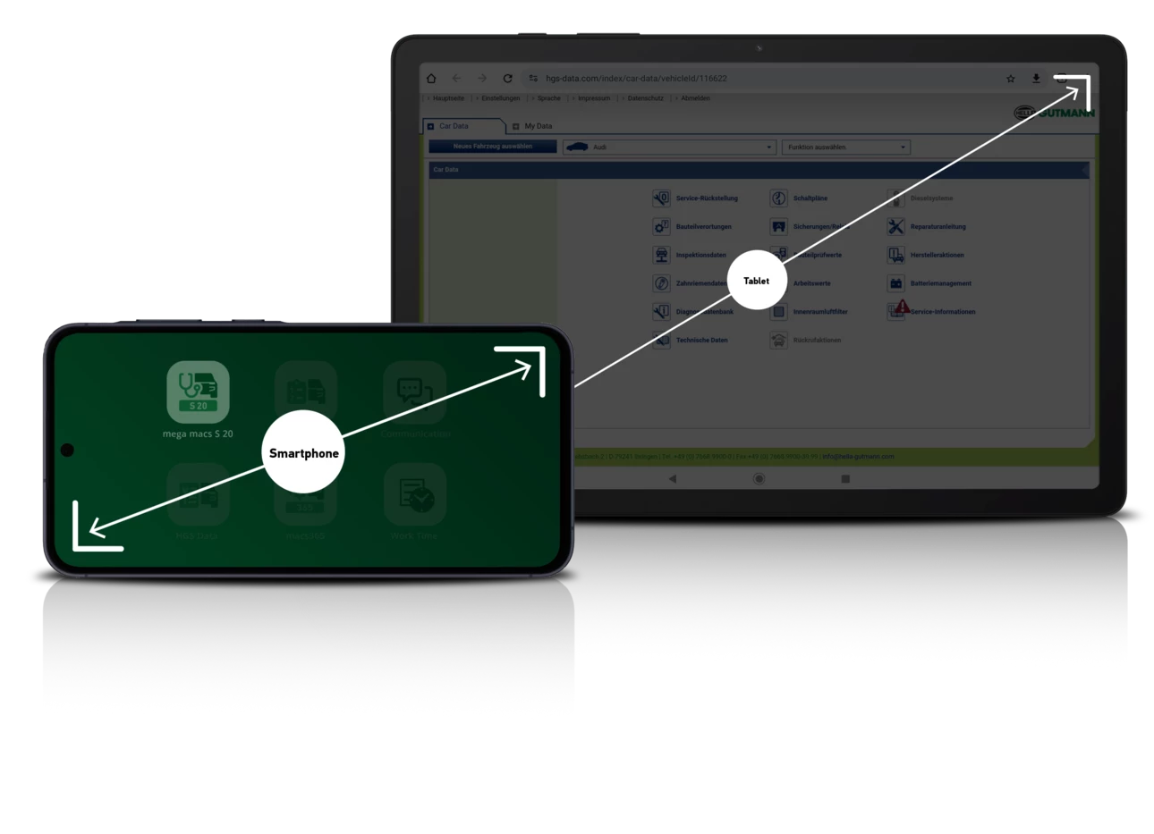 Die Kombination der Diagnose-App mit den bereits installierten Apps und dem Android-Endgerät (mind. 8") Deiner Wahl macht den mega macs S 20 zum echten Überflieger. Mit ein und demselben Gerät diagnostizierst und kommuniziertst Du, holst Dir Zusatzinformationen aus dem Netz an Deinen Arbeitsplatz, kontrollierst Dein Zeitmanagenment und vieles mehr.